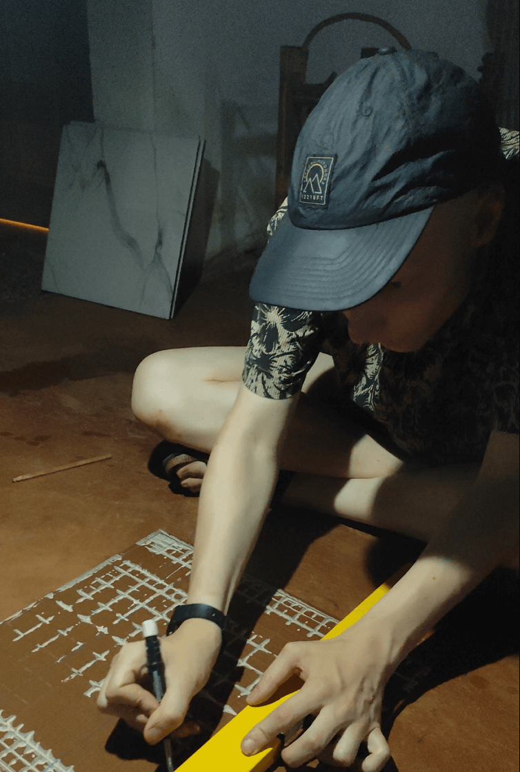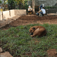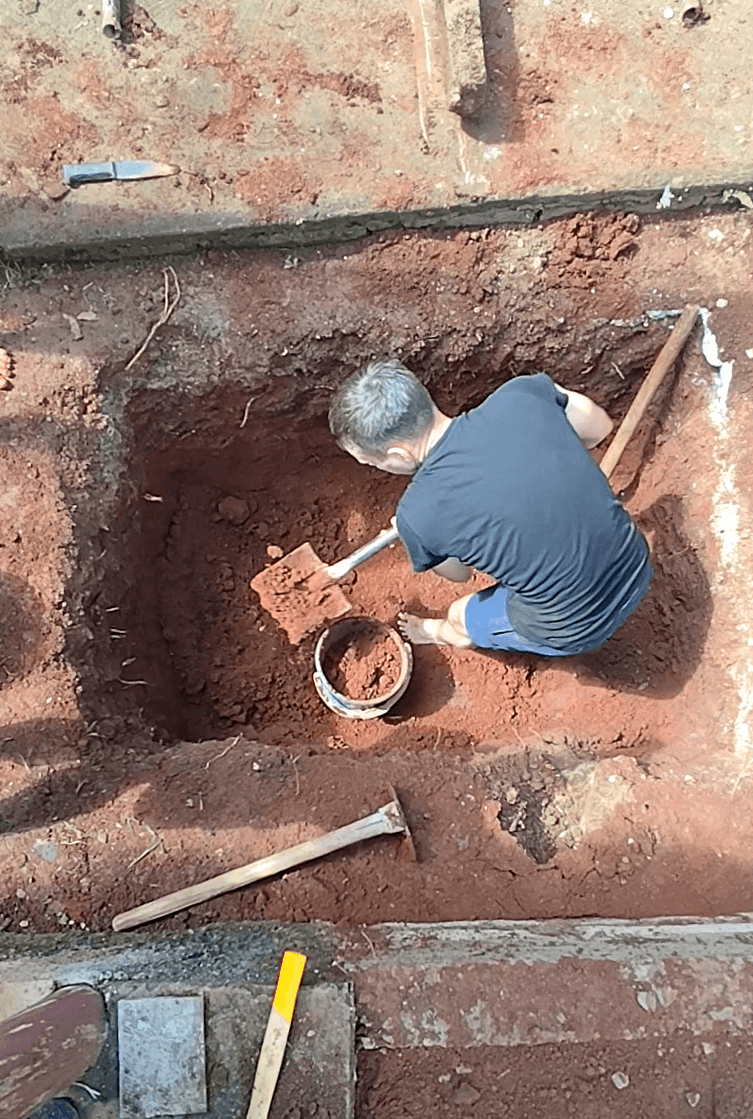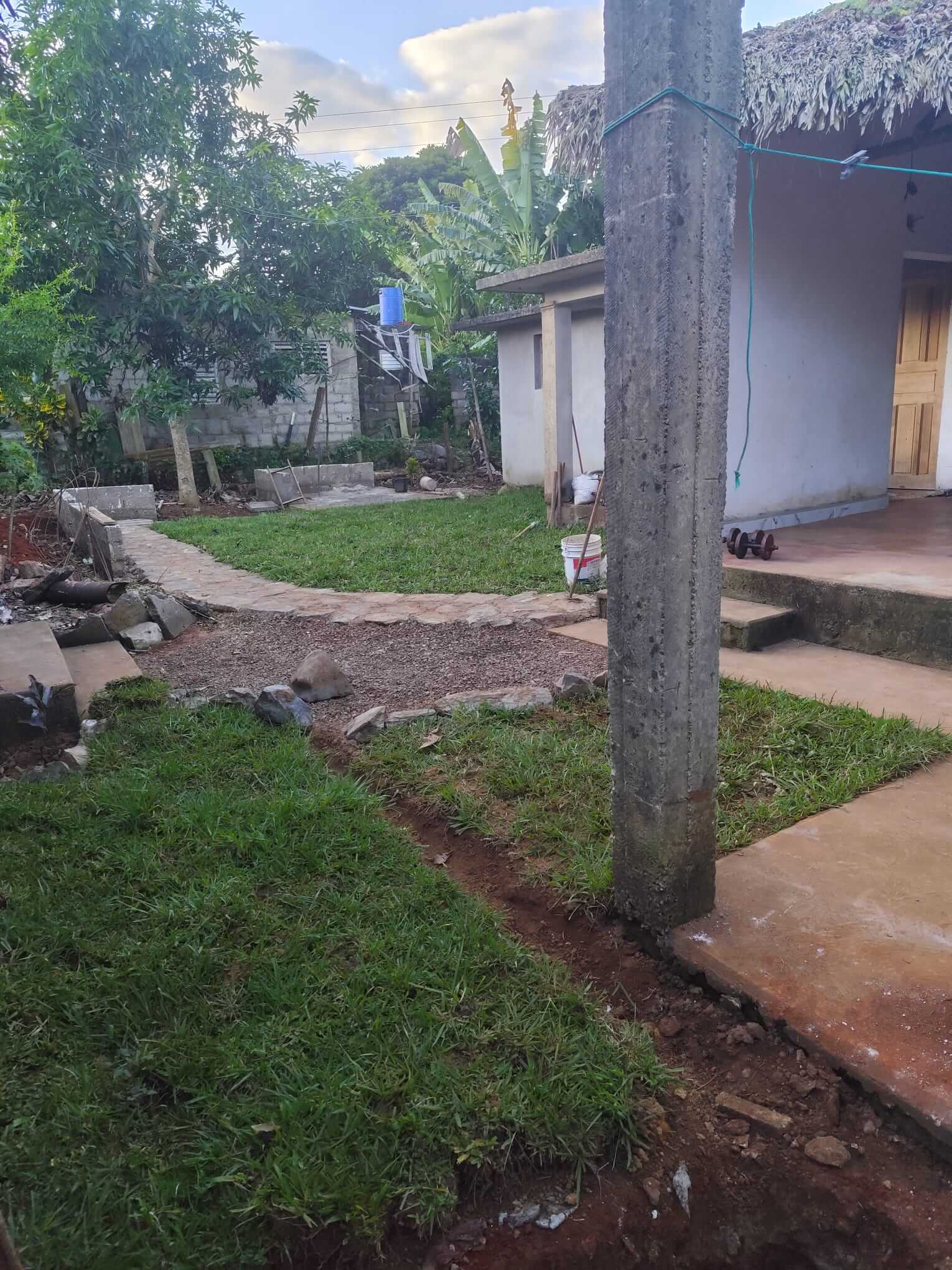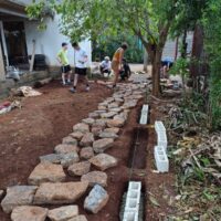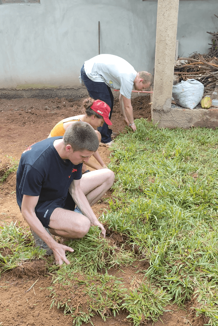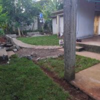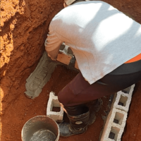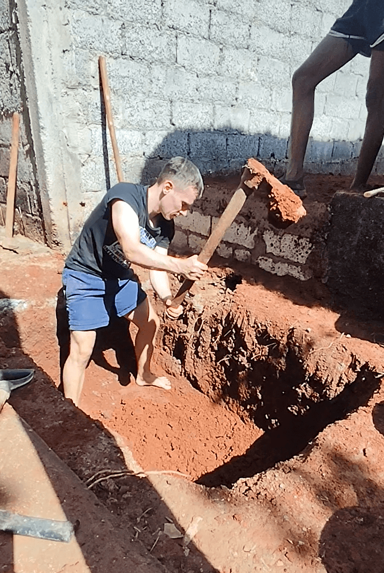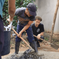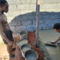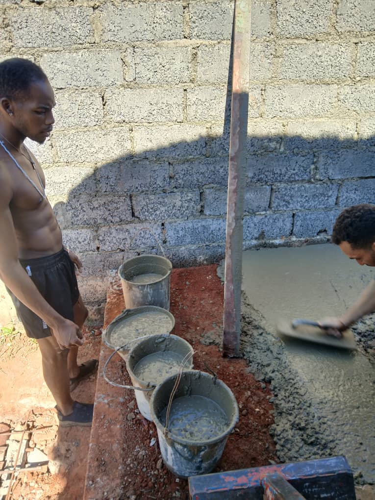 Außerdem wurden 40 cm große Fliesen zugeschnitten und als Fußleisten in der Unterkunft sowie rund um die Bühne angebracht. Dies trug nicht nur zur ästhetischen Aufwertung bei, sondern auch zur Haltbarkeit und Sauberkeit der Räume. In der Audio-Kabine wurden Wände verputzt, der Strom verlegt und Steckdosen installiert – eine zentrale Infrastruktur für künftige Kultur- und Veranstaltungsaktivitäten. Die Herausforderung bestand darin, unter erschwerten Bedingungen mit unzuverlässiger Strom- und Materialversorgung zu arbeiten. Zum Schluss wurde eine Grube gegraben und mit einem Gulli verschlossen. Ziel war es, Wasser in der Regenzeit effizient abzuleiten und Staunässe auf dem Grundstück zu verhindern. Diese Maßnahme trägt langfristig zum Erhalt und zur Sicherheit des Geländes bei.