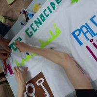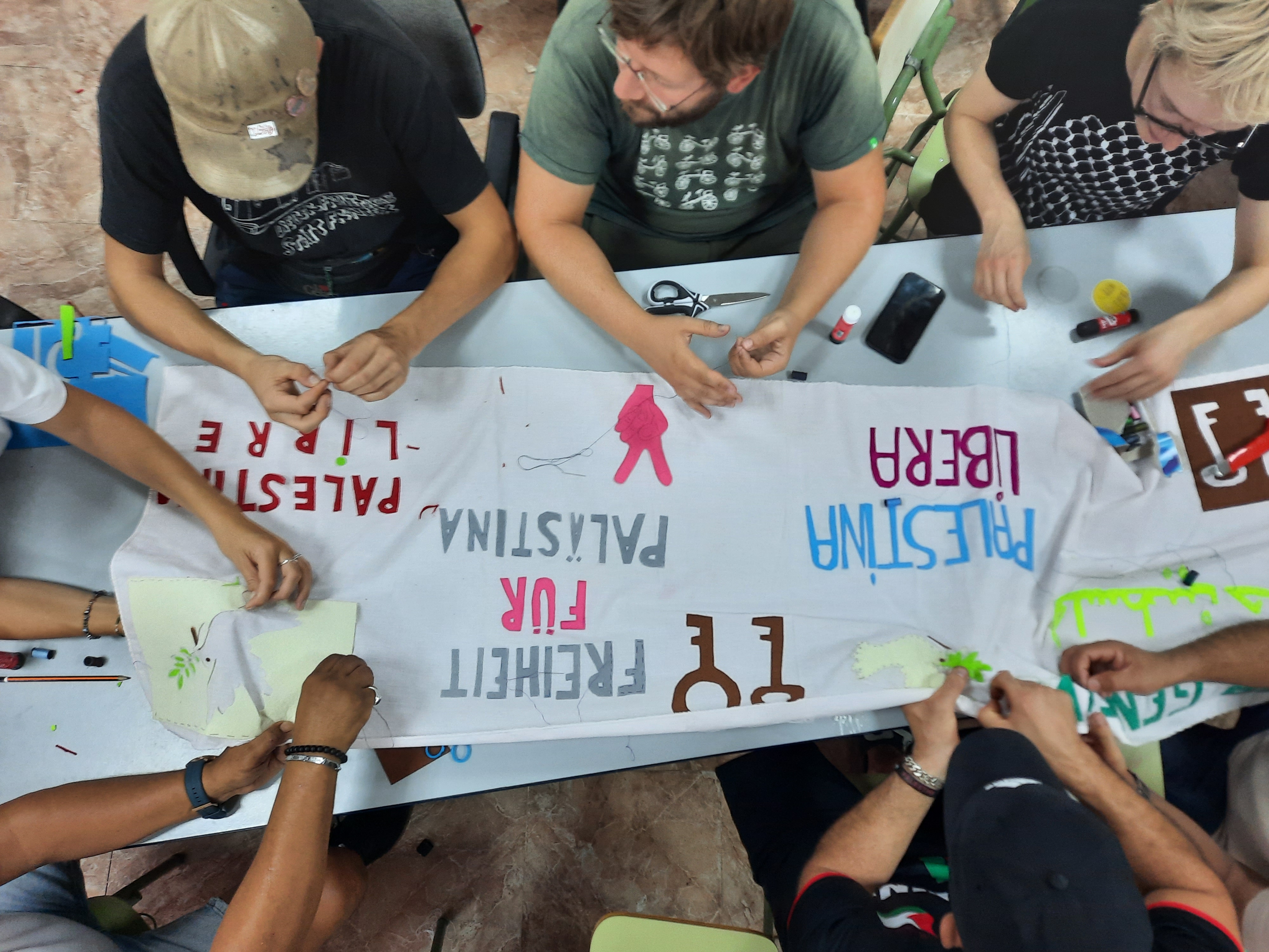 Además, cosimos pancartas con la reivindicación de una Palestina libre en los diferentes idiomas de los trabajadorxs (árabe, rumano, español, alemán e inglés) para expresar también el compañerismo internacional del SOC-SAT. En el primer taller mostramos cómo se pueden pintar formas con plantillas de cartón sobre tela u otros materiales y comunicar así mensajes. El resultado fue una pancarta con el logotipo de SOC-SAT, manos entrelazadas y un ojo, que una compañera resumió con el lema «Somos el SOC-SAT, miramos los derechos de lxs trabajadorxs y luchamos juntxs». Esta pancarta ya cuelga en la barra de la cocina del local del sindicato, que en el futuro podría convertirse en la barra de la cafetería. Estamos curiosxs ver cómo se desarrolla este plan.