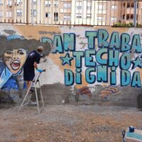 Auch sind die Wörter für uns immer noch aktuell und stehen klar für das was sie sagen: Brot, Arbeit, Dach und Würde. Unsere Arbeit hat sich seit dem Beginn verändert. Wir wollen deshalb auch den Beginn durch das Wandbild nicht einfach übermalen, sondern ergänzen und erneuern. Der Spruch ‘Pan, Trabajo, Techo y Dignidad’ soll deshalb erhalten bleiben. Wir wollen jedoch zu der einen einzelnen Person eine Zweite dazu setzten und somit unsere Organisierung als eine kollektive verorten. Gemeinsam soll das Bild diese Woche mit Gewerkschaftsaktiven der SOC-SAT und ver.di umsetzten werden, und damit auch deren Beziehungen und Kämpfe gestärkt werden. Denn erinnern und kämpfen gehören für uns eng zusammen.