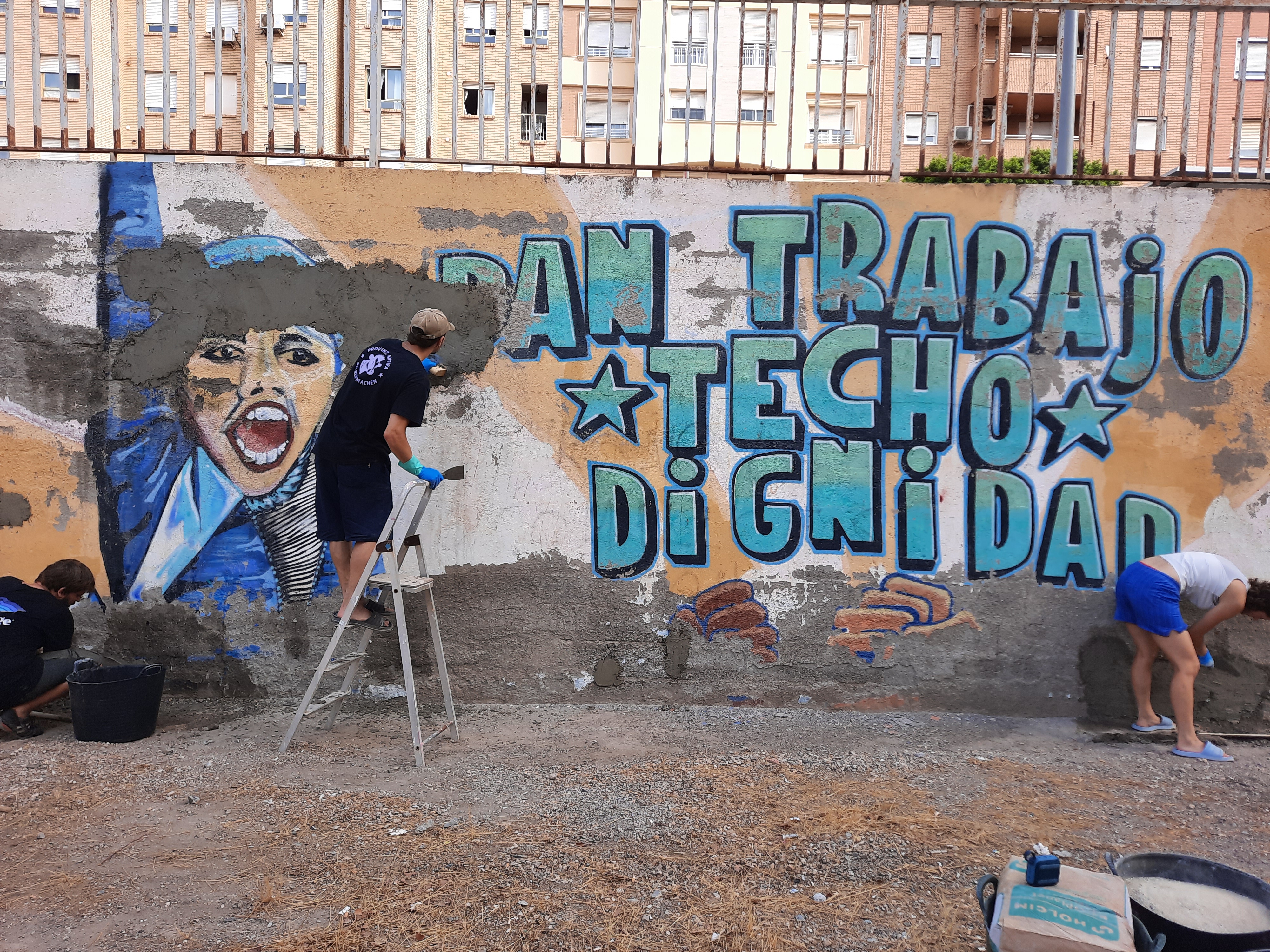 Die Wand, die den Eingang zum SOC-SAT Büro aufmacht wollen wir restaurieren. Vor fast 10 Jahren wurde von der Brigade Gerda Taro 2016 das Wandbild gemalt. ‘Pan, Trabajo, Techo y Dignidad’ steht in großen Buchstaben in der Mitte. Diese Wörter findet man immer wieder im Kontext der historischen Arbeiter:innbewegung. ‘Pan, Trabajo y Libertad’ ist zudem auch ein wichtiger Ausdruck des Protests gegen die Unterdrückung der andalusischen Arbeiter:innenklasse durch den spanischen Staat. Francisco Javier Verdejo Lucas, ein junger Kommunist, begann am 13. August 1976 diese Wörter an ein geschlossenes Strandbad in Almería zu sprühen. Jedoch wurde er dabei von der Guardia Civil unterbrochen und auf der Flucht am Sandstrand von Almería durch den Kopf erschossen. Dieser Mord lies damals viele Menschen für Brot, Arbeit und Freiheit, und gegen staatliche Polizeigewalt auf die Straßen kommen.