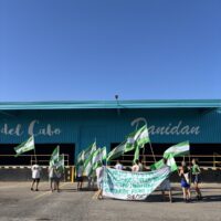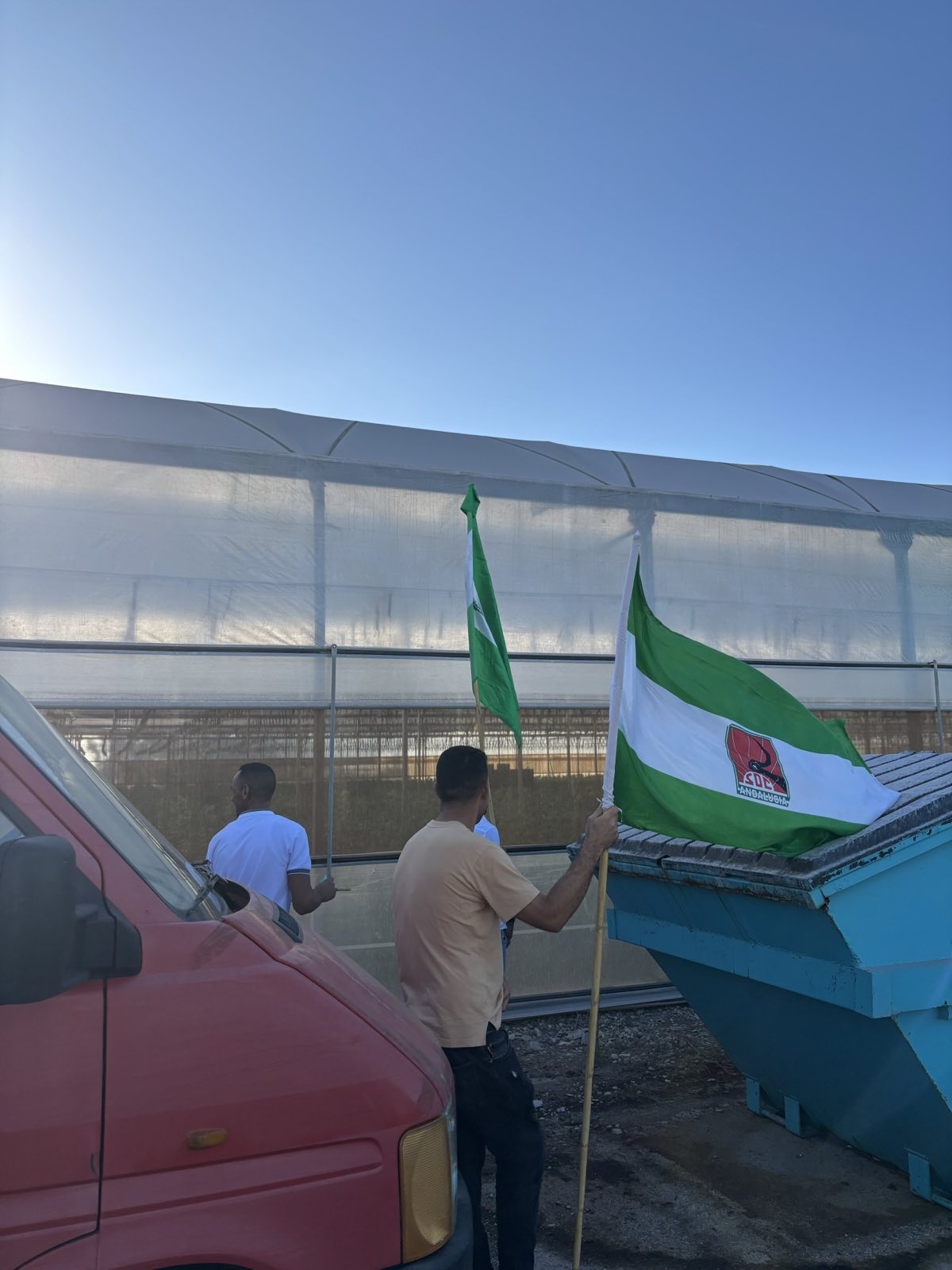 Además, participamos repetidamente en acciones sindicales, como la manifestación de la semana pasada frente a las naves de envasado de la empresa Danidan. Estuvimos allí junto con lxs trabajadorxs de la empresa, que a pesar de tener un contrato indefinido no han recibido trabajo para la última cosecha. La acción sindical directa tenía como objetivo interrumpir brevemente el funcionamiento de la empresa con muchas banderas, llamar la atención sobre la organización sindical y reforzar la cohesión del grupo. Al día siguiente, tras la visita de la inspección de trabajo, la empresa anunció que entablaría negociaciones con los trabajadorxs. Esto se debe al trabajo de SOC-SAT y de lxs trabajadorxs organizadxs, que han ejercido presión desde abajo mediante varias denuncias ante la inspección de trabajo, la organización sindical en la empresa y esta acción de protesta.