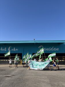Darüber hinaus sind wir auch immer wieder bei gewerkschaftlichen Aktionen dabei, wie letzte Woche bei der Demonstration vor den Abpackhallen des Betriebes Danidan. Wir waren dort gemeinsam mit Arbeiter:innen des Betriebs, die trotz unbefristetem Vertrag keine Arbeit für die neueste Ernte bekommen haben. Die direkte Gewerkschaftsaktion zielte darauf ab, kurz mit vielen Fahnen den Ablauf des Betriebes zu stören, auf die gewerkschaftliche Organisierung aufmerksam zu machen und den Zusammenhalt der Gruppe zu stärken. Nachdem am nächsten Tag die Arbeitsinspektion kam, hat das Unternehmen angekündigt in Verhandlung mit den Arbeitenden zu gehen. Dies ist der Arbeit der SOC-SAT und den organisierten Arbeiter:innen zu verdanken, die durch mehrere Klagen bei der Arbeitsinspektion, der gewerkschaftlichen Organisierung im Betrieb und diese Protestaktion Druck von unten aufgebaut haben.
