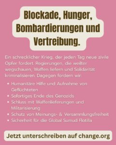 wir rufen euch dazu auf die folgende Petition für die Sicherheit der Global Sumud Flotilla zu unterzeichnen, um ein Zeichen gegen den Krieg in Gaza zu setzen!