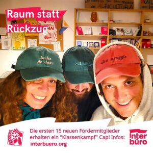 Die ersten 15 neuen Fördermitglieder erhalten zu ihrer Fördermitgliedschaft eine Cap mit dem Wort „Klassenkampf“ auf Spanisch, Arabisch, Englisch oder Deutsch. Ein Zeichen dafür, dass unser Kampf global ist – also seid schnell! Ab 5 € im Monat tragt ihr dazu bei, das Interbüro als unabhängigen Ort der gelebten internationalen Solidarität zu erhalten.
