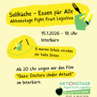 Es wird einen kleinen Input zu den Aktionstagen geben und warum es Widerstand gegen die Fruit Logistica braucht. Dazu gibt es Essen gegen Spende.